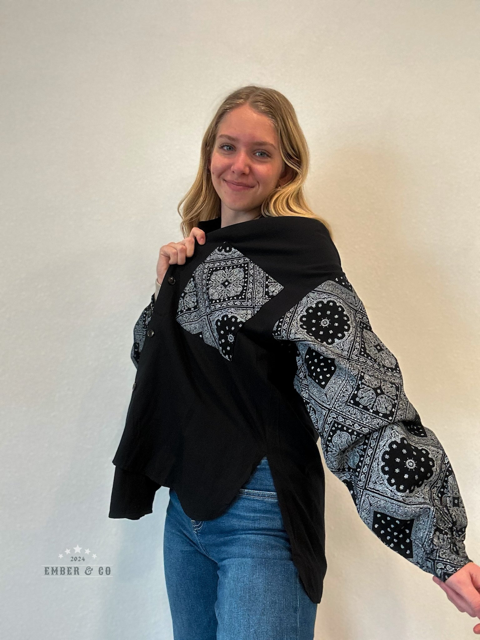 Add some edge to your wardrobe with our Bandana Sleeve Button-Up! The black color and bandana-inspired sleeves and pockets make for a unique and stylish look. The button-up design adds versatility, making it perfect for any occasion.