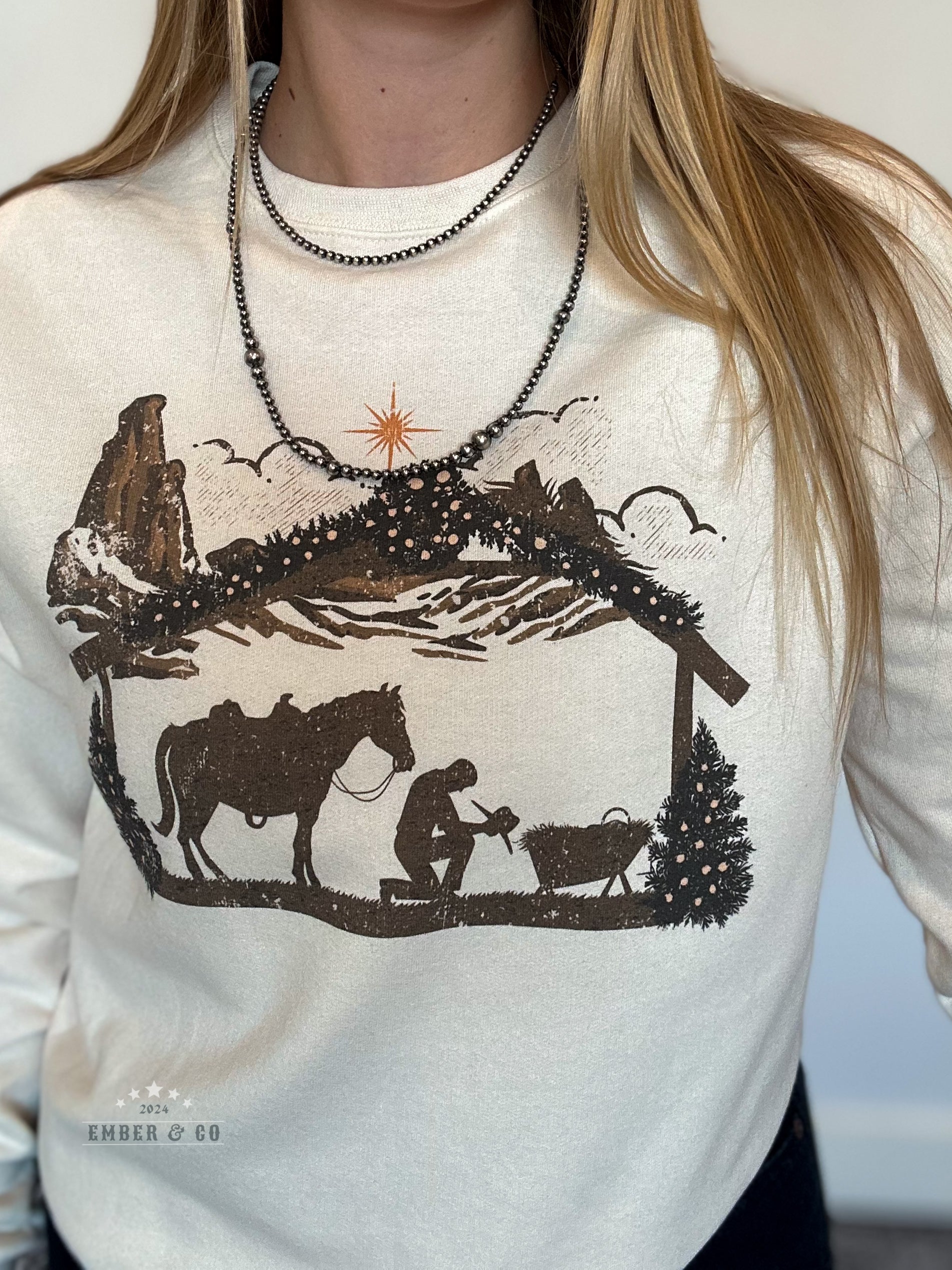 A natural-colored crewneck with a Christmas print of a cowboy praying in a manger. This cozy piece is true to size and perfect for the holidays!