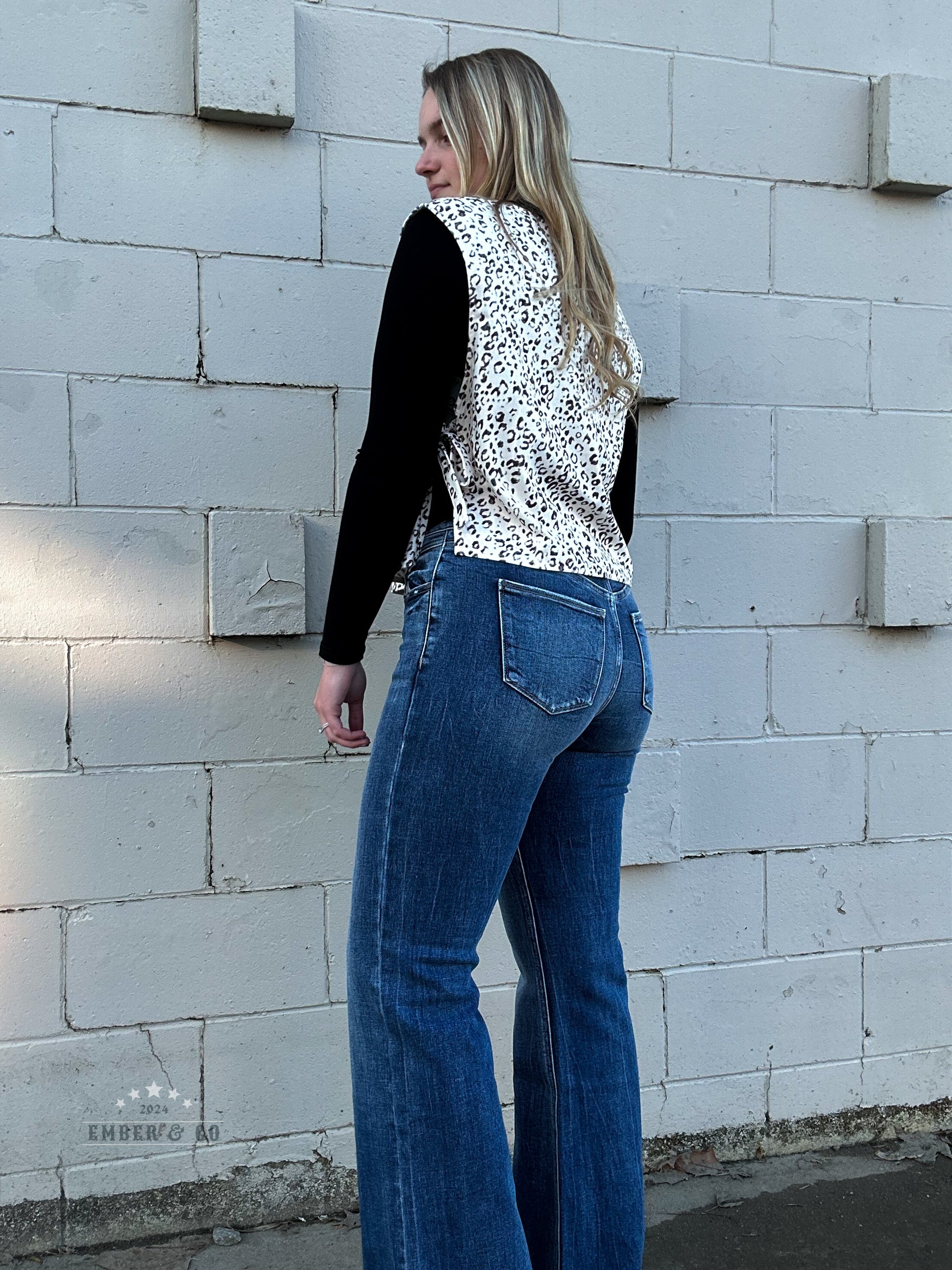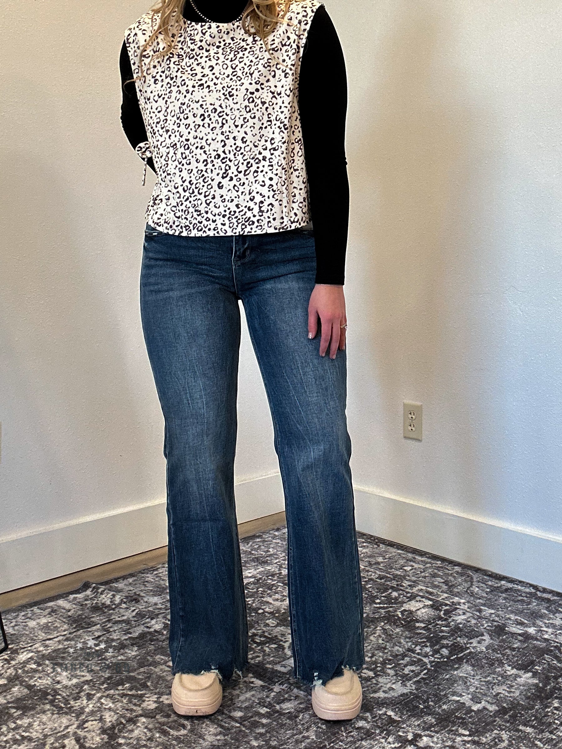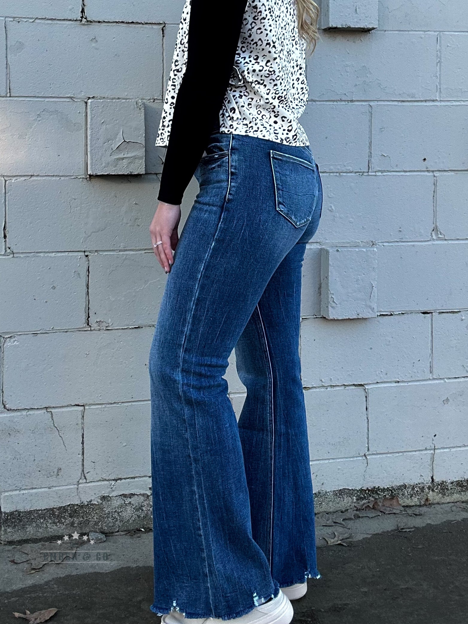 A medium-dark denim with double button closure. Features a frayed hem, high rise fit, and trouser style. Stretchy and very comfortable material!