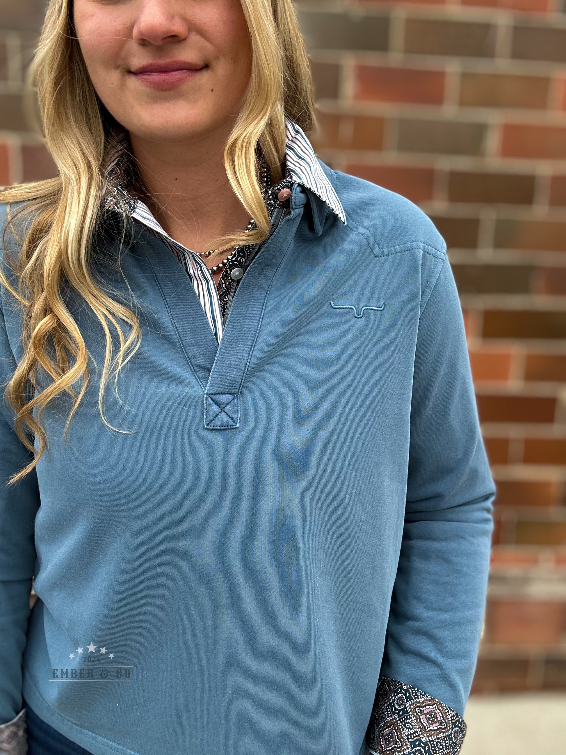A gorgeous blue long sleeve by Kimes Ranch. Features a v-neck style to pair with collared button-ups but also adorable on its own! A very lightweight material.