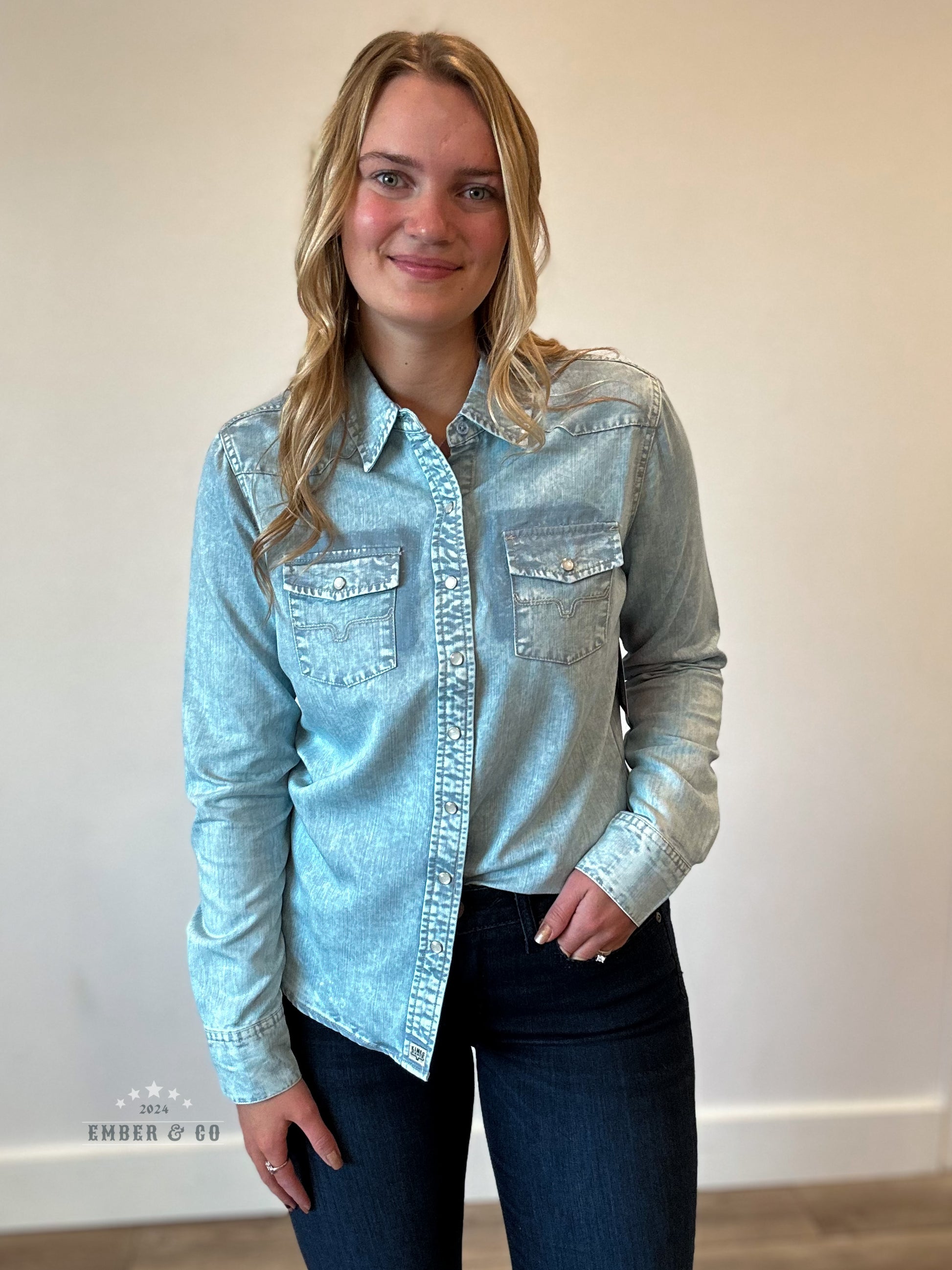 Show off your cowboy style with the KR KC Tencel Button Up from Kimes Ranch. This light blue shirt features pearl snap buttons and an embroidered logo on the pockets, making it the perfect stylish combination. Stay comfortable and cool all day in this quality button up.
