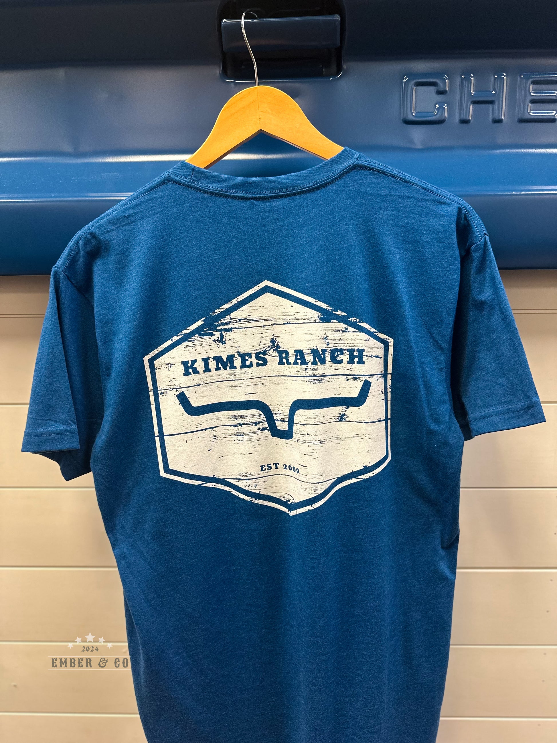 The KR Men's Wooden Hex Tee features the Kimes Ranch brand logo printed on blue fabric, embodying a rugged Western style with the distressed wood-style background. Perfect for those who value authentic ranch heritage in their everyday wardrobe.
