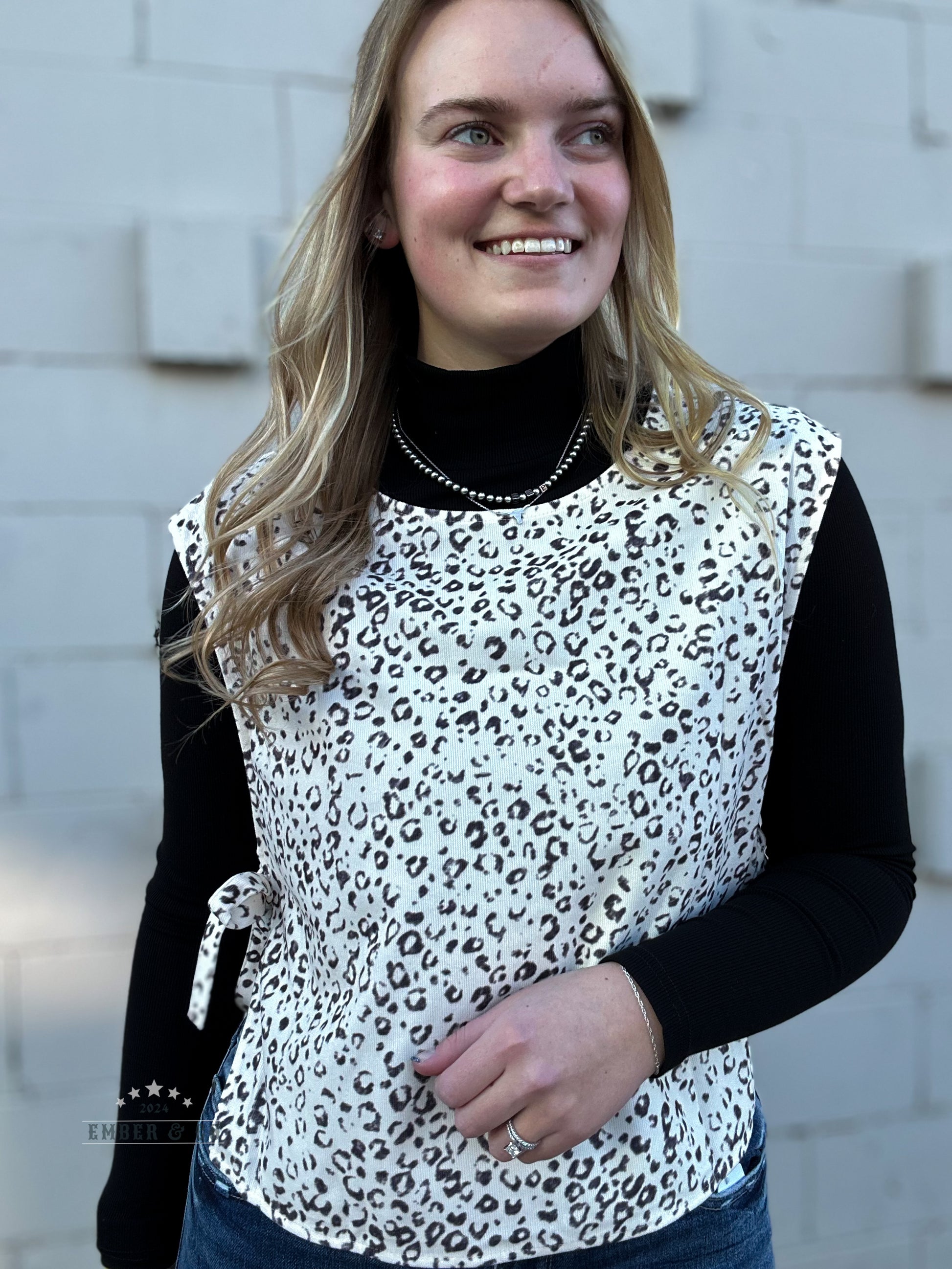 A sweater-vest look without the weight! Dress up an outfit with this leopard vest that ties on the side. Pairs with long sleeves or a tank in the summer.