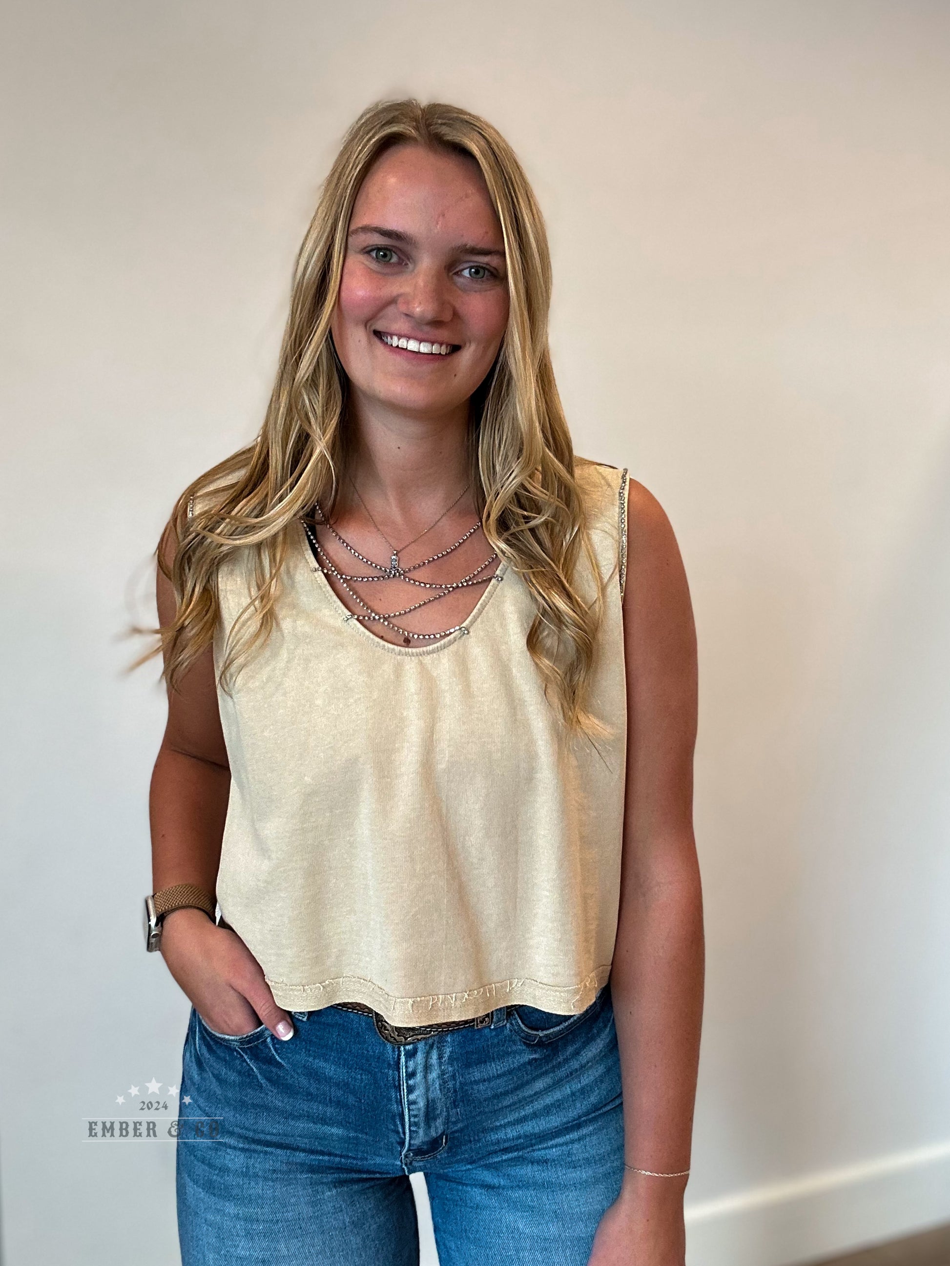 This versatile tank comes in a beautiful khaki and kelly green color and features a trendy cropped design. The rhinestone cross front adds a touch of glamour to your look, while the fabric ensures maximum comfort. Look stylish and feel confident in this piece!